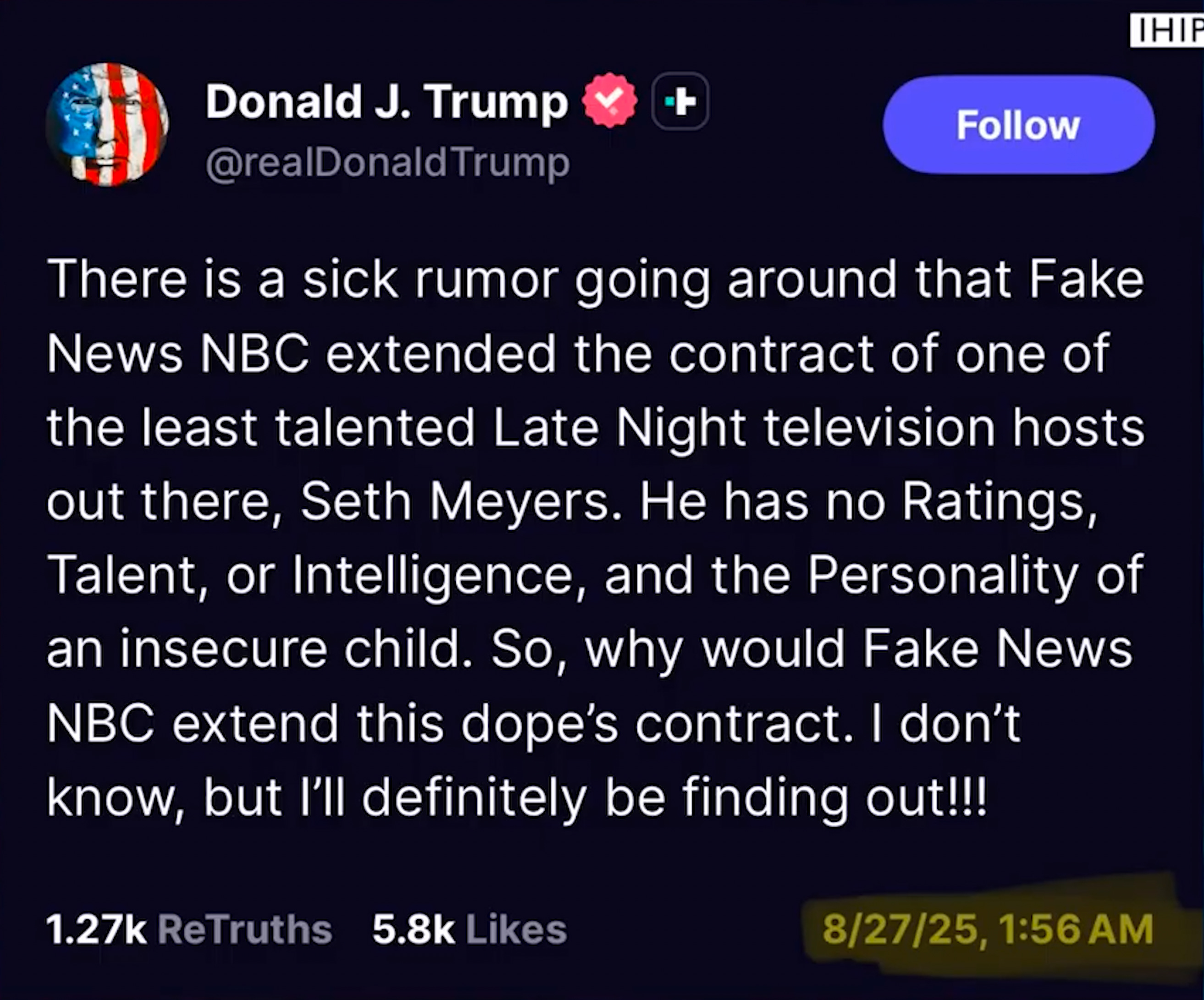 So he's triggered by late night comedians, terrified of late night comedians. And he puts on lie social…And I want to remind everybody, this is the president of the United States. 1:56 a.m. on a social media platform that he had to create because he was kicked off of all of the others because he tried to overthrow the government.